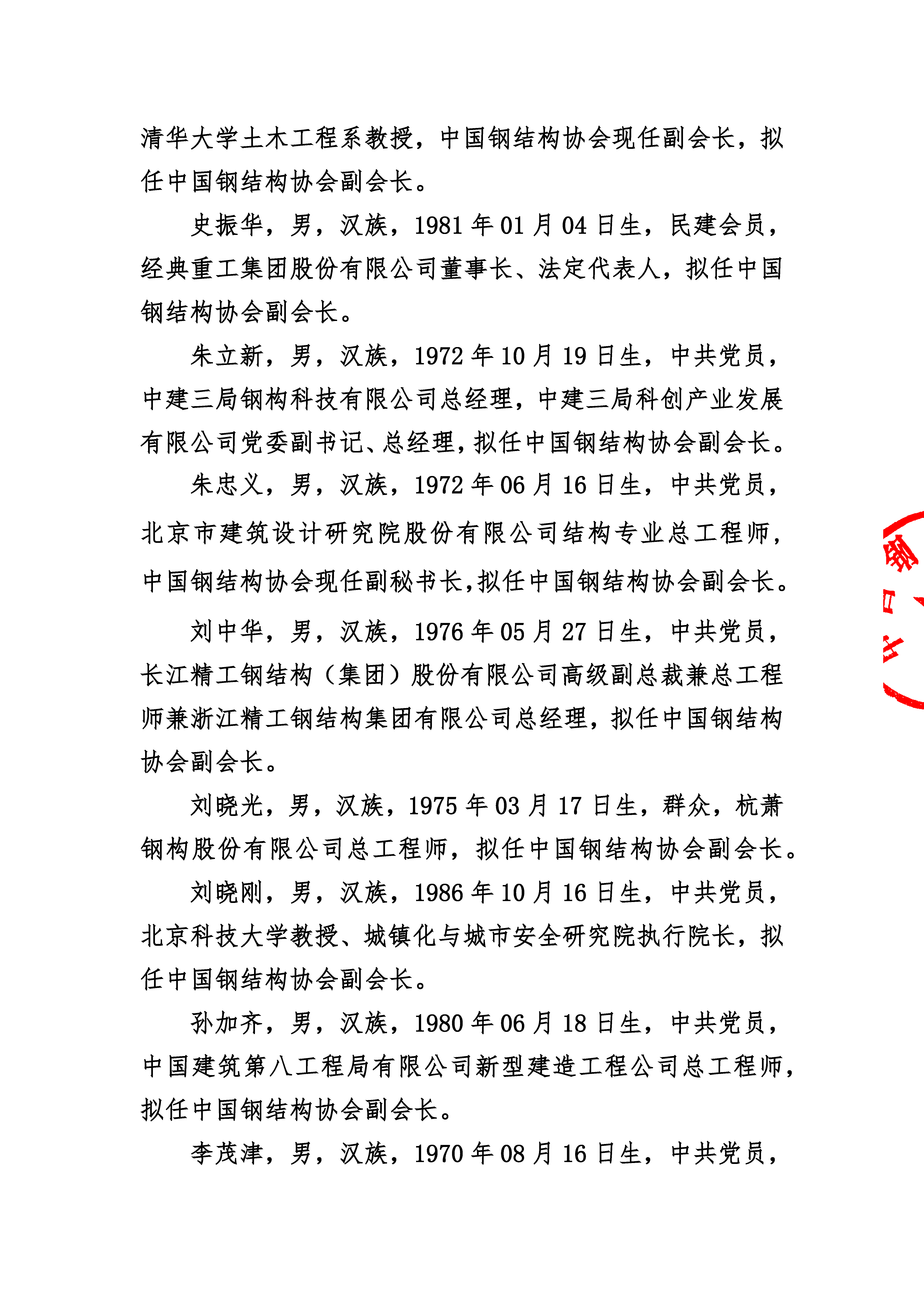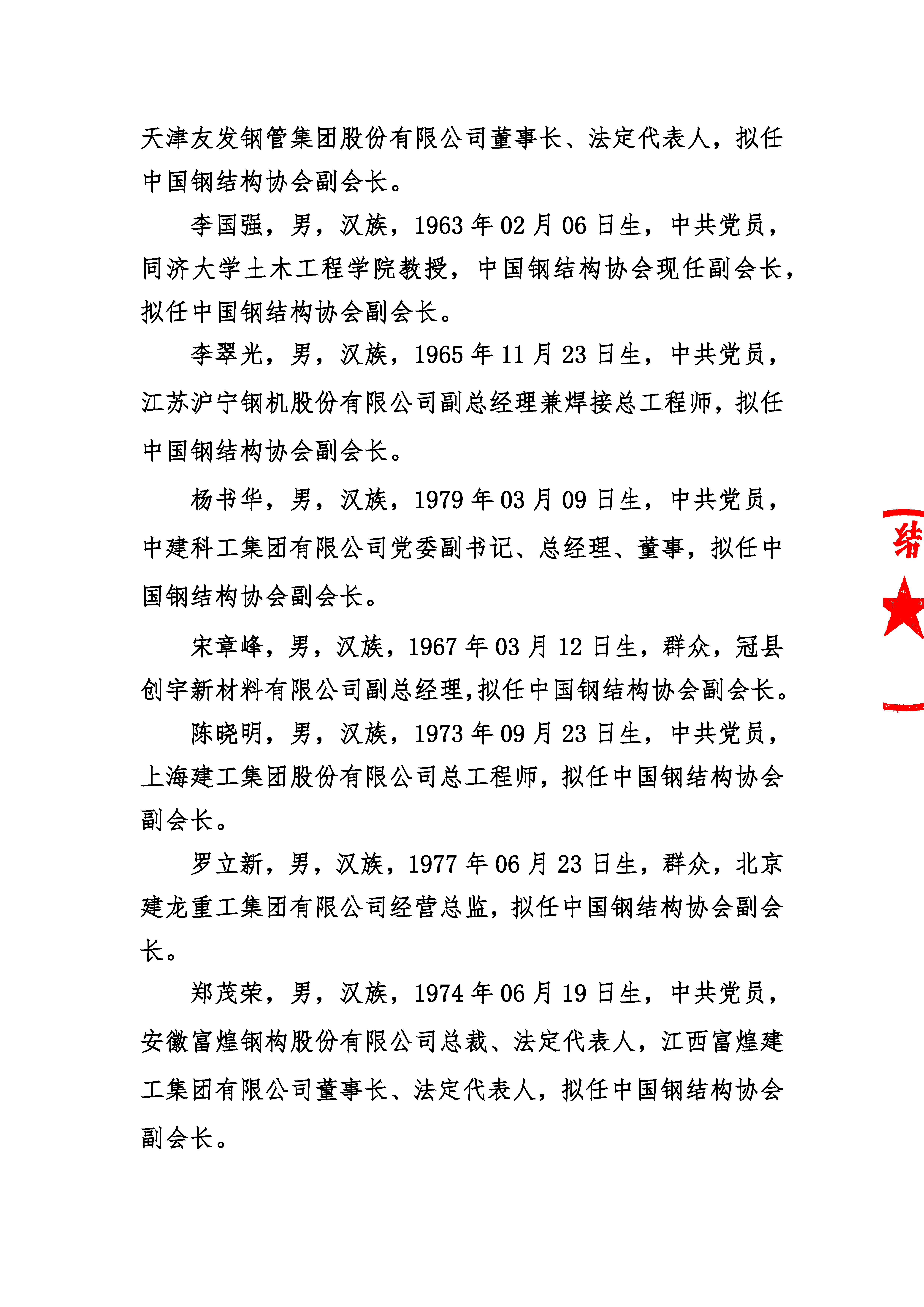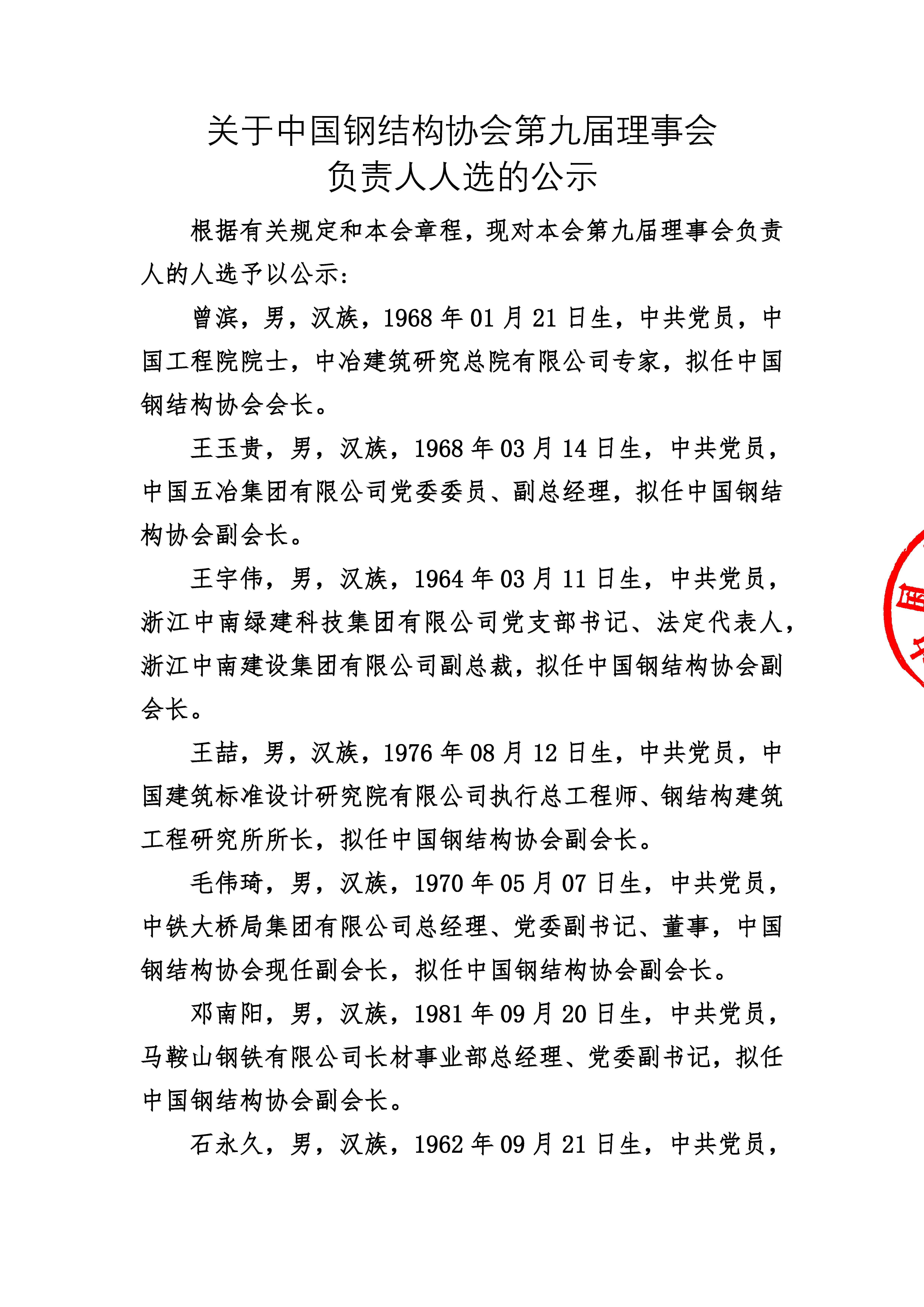 關于中國鋼結構協會第九屆理事會負責人人選的公示