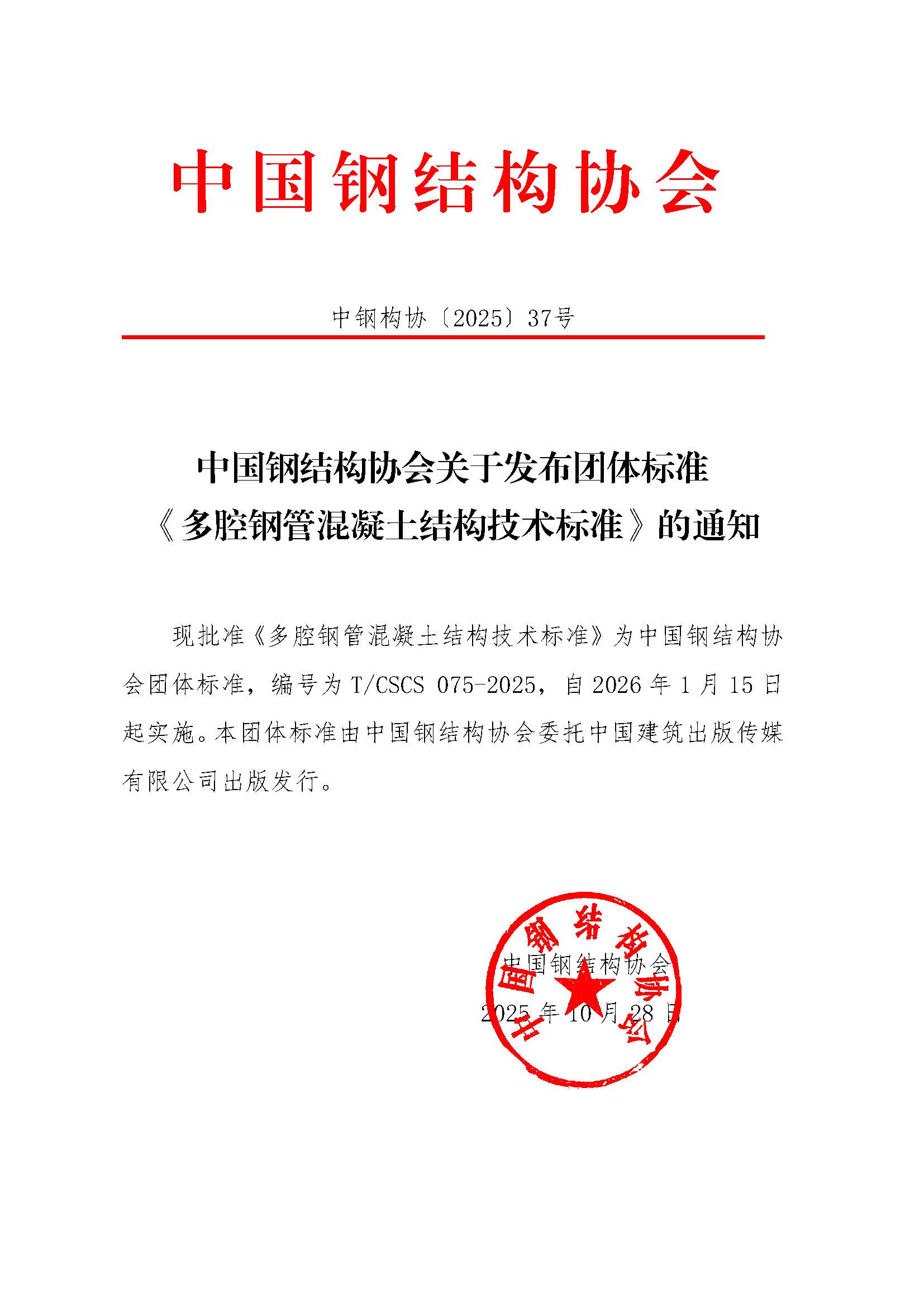 中國鋼結構協會關于發布團體標準《多腔鋼管混凝土結構技術標準》的通知